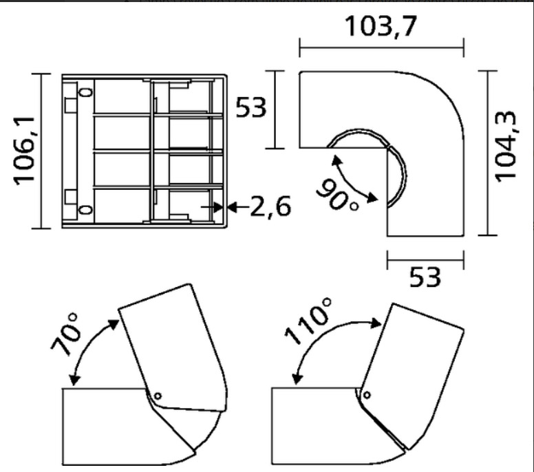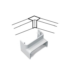 El codo externo móvil se utiliza en ángulos externos de paredes y superficies en las que se instala el cableado. Permite la apertura entre 70 ° y 105 °, con un radio mínimo de curvatura de 1 «.